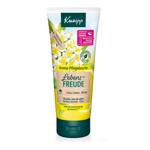 Genießen Sie die Schönheit des Lebens mit der belebenden und aktivierenden Kneipp® Aroma-Pflegedusche Lebensfreude. Der frische, sonnige Duft der natürlichen ätherischen Öle der Litsea Cubeba und der Zitrone hebt Ihre Stimmungslage nachweislich*. Natürliches pflegendes Öl verwöhnt die Haut und macht sie zart und geschmeidig. Die pflanzliche Pflegeformel verbessert das Hautgefühl während und nach dem Duschen. Eine Studie bestätigt zudem, dass die Haut vor dem Austrocknen geschützt wird**.