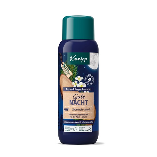 Entspannung am Abend für eine erholsame Nacht: Genieße Dein Abendritual und bereite Dich mit dem Kneipp® Schaumbad Gute Nacht auf erholsamen Schlaf vor. Das Bad mit ätherischen Ölen aus Zirbenholz und Amyris, dem beruhigend, warm-holzigen Duft und dem tiefblauen Wasser lässt Deine Gedanken zur Ruhe kommen, Dich dadurch besser einschlafen und so am nächsten Morgen erholt aufwachen. Mit natürlichem pflegendem Öl bewahrt das Bad die Feuchtigkeit der Haut. Gute Nacht - Besserer Morgen!