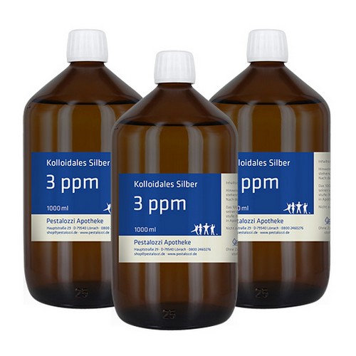 Das kolloidale Silber 3 ppm wird mit hochreinem destillierten Wasser unter qualifizierten Laborbedingungen frisch hergestellt und in einer dunklen Glasflasche geliefert. Die Herstellung erfolgt in der Apotheke unter überwachten Laborbedingungen. Das kolloidale Silber wird auf elektrolytischem Wege mit Hilfe eines entsprechenden Generators hergestellt. Dabei werden aus 99,99% reinem Silber kleinste Partikel gebildet und in destilliertem Wasser verteilt. Wir arbeiten dabei ohne Einsatz von Zusatzstoffen. Bitte beachten Sie: Kolloidales Silber ist kein Arzneimittel und daher auch ohne Angabe einer Indikation. Aus rechtlichen Gründen bieten wir daher das kolloidale Silber nur für technische Zwecke an. Nicht zum Einnehmen.