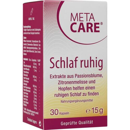 META-CARE® Schlaf ruhig enthält Extrakte der bewährten Pflanzenstoffe Passionsblume, Zitronenmelisse und Hopfen. Dazu kommen Withaniawurzel (Ashwagandha), auch als Schlafbeere bezeichnet, Safran, Melatonin und Zink.