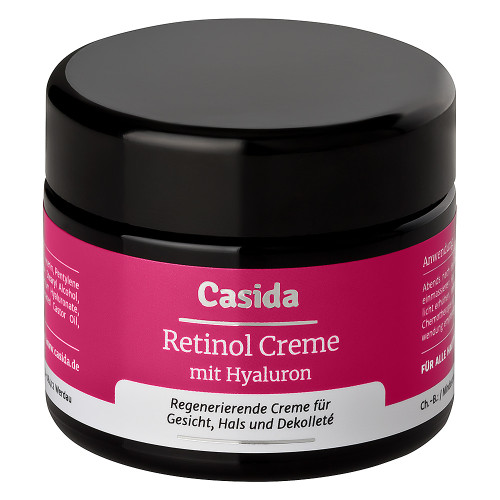 Die Casida Retinol Creme mit Hyaluron ist eine intensiv pflegende Anti-Aging Creme für Gesicht, Hals und Dekolleté. Die Haut wird von innen heraus aufgepolstert und Falten werden gemildert. Für eine sichtbar glattere Haut. Das enthaltene Retinol fördert die Regeneration und Erneuerung der Hautzellen. Hyaluron versorgt die Haut mit Feuchtigkeit und erhöht die Spannkraft der Haut.