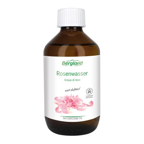 Bergland Rosenwasser duftet zart nach frischer Rosenblüte. Es erfrischt, reinigt und kühlt und empfiehlt sich ganz besonders als Gesichtswasser und für Kompressen. Rosenwasser ist auch eine bewährte Grundlage für die Herstellung eigener Emulsionen.